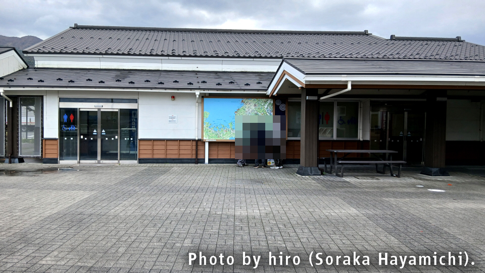 トイレは木造建築に見立てた建物をしており、豪雪地帯に配慮して自動ドアを出入口に設けている。