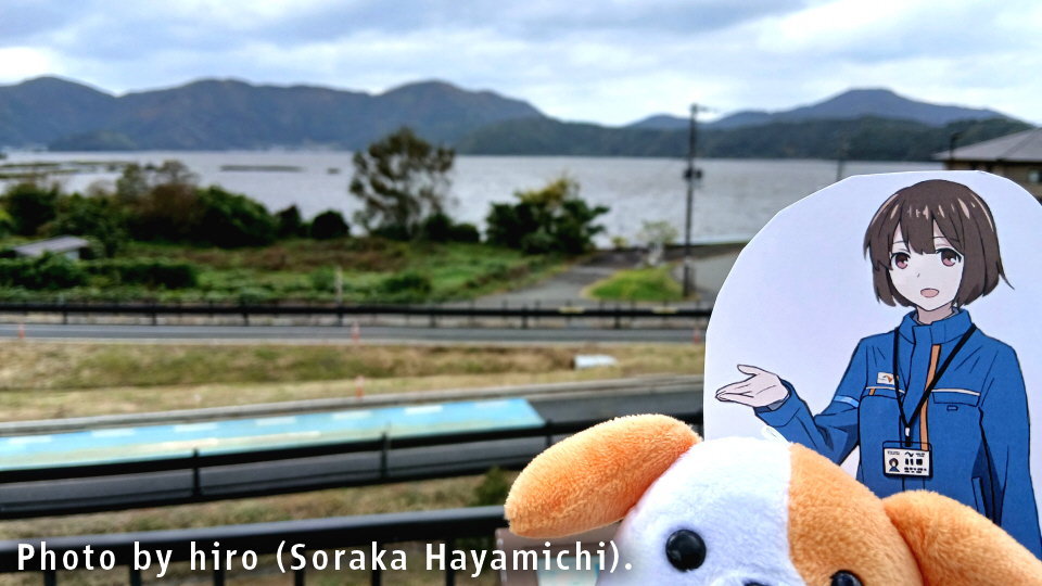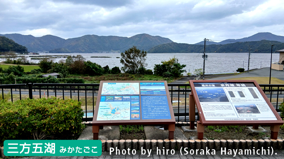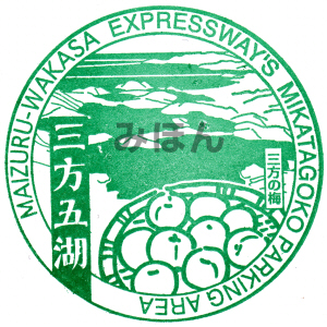 上りランプ跨道橋の先に展望台があり、PA名称の由来となった三方五湖(三方湖)を一望できる。