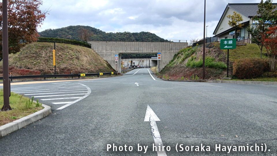 下りの三方五湖展望台へ通じる跨道橋の真下に、一方通行の本線復帰通路が用意されている。