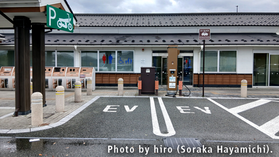 EVスタンド。どこにあるか迷いがちな下りと異なり、上りは二輪車向け駐車場の隣に設けられている。