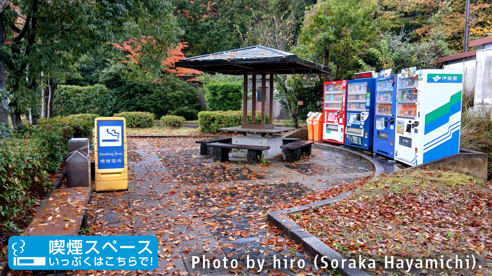 入口通路脇の木製ベンチの部分に自動販売機4基と喫煙スペースを用意している。