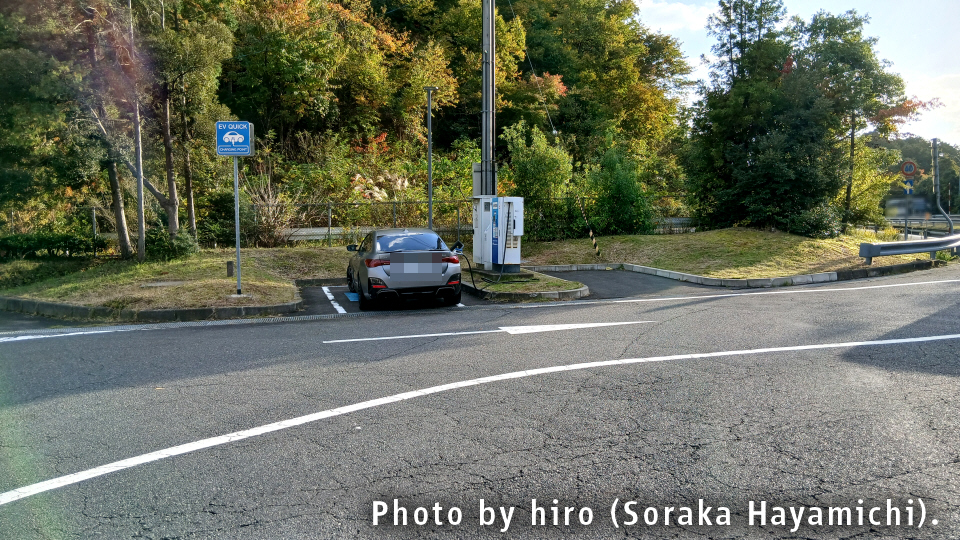 下り同様、トイレ休憩のみのパーキングエリアとしては珍しく、EVスタンドが設置されている。