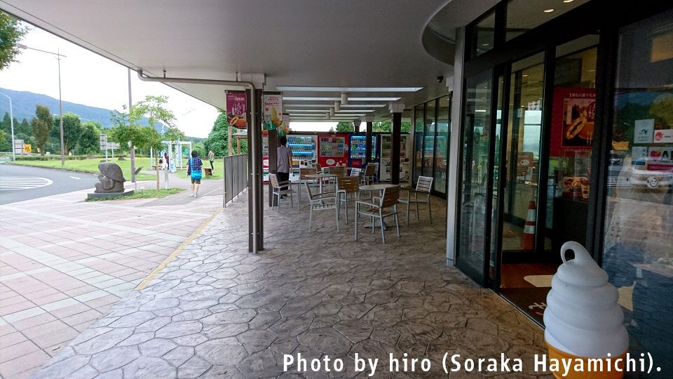購買施設の中央口付近は屋外型のテーブル席があり、その隅に自動販売機を構える。