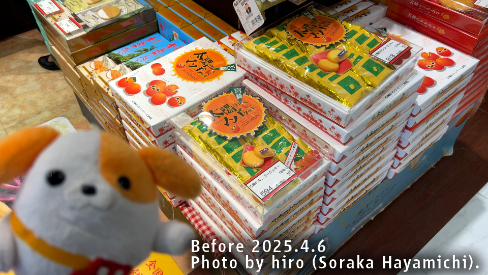 宮崎みやげは、マンゴーの加工品が多いように感じる。他は炭火焼・チーズ饅頭とか。