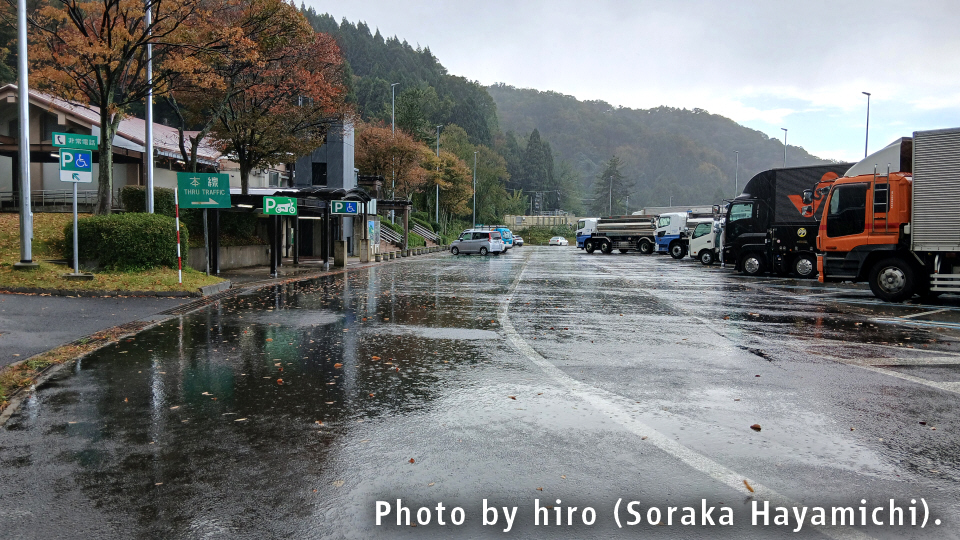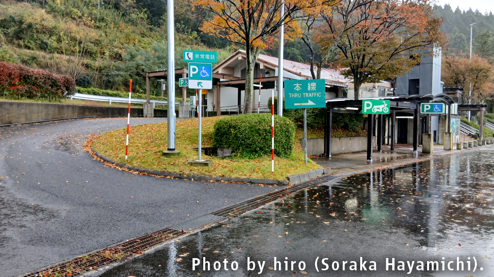 敦賀トンネルや旧・北陸線跡地の流用などの理由で、上下線が大きく隔離された杉津PA。