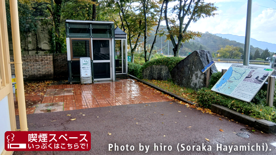 高台の南側に喫煙スペースを確保。旧・杉津駅に関する説明板もある。