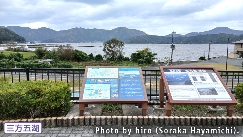 道の駅及び、近接のE27舞鶴若狭道の休憩施設から、三方五湖(三方湖)を一望できる。