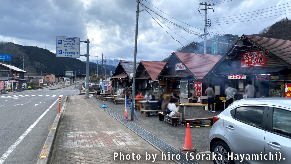 道の駅の斜向かいにある戸河内バスセンター前には、テイクアウト専門店が軒を連ねる。