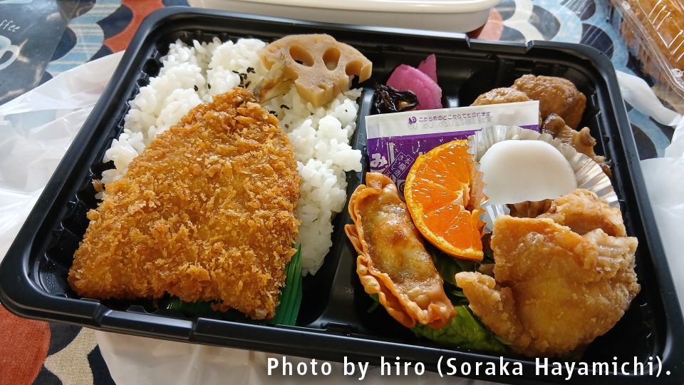 アジフライとセットで揚げ物弁当も。リーズナブルなお値段で売られており、人気商品である。