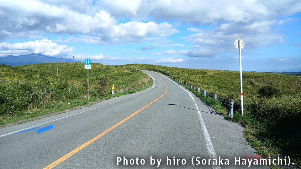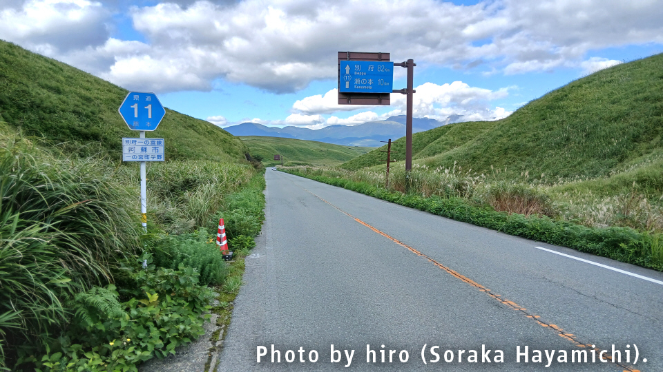 解説:ほぼ全線が阿蘇高原地帯を通る「ミルクロード(菊池阿蘇スカイライン)」の一部を構成しており、終点の国道212号までは南側に阿蘇山・北側に久住連山を一望できる観光道路。眺めがよく菊池渓谷に近いこともあり、春の大型連休などを中心にドライブ・ツーリングにおける定番コースとなっている。