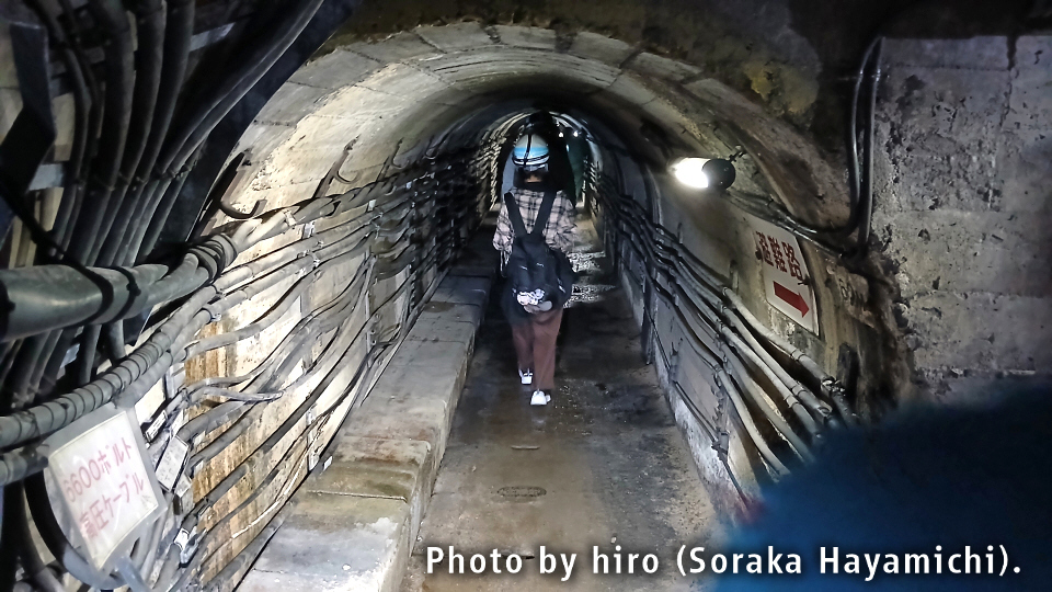 調査目的で掘ったため、パイロットトンネル内はとにかく天井が低い。高身長の人には厳しいかもしれない。脇には排水管や複数の電気ケーブルが敷かれ、普段目にする車道・人道とは違った独特の空間を体験できる。